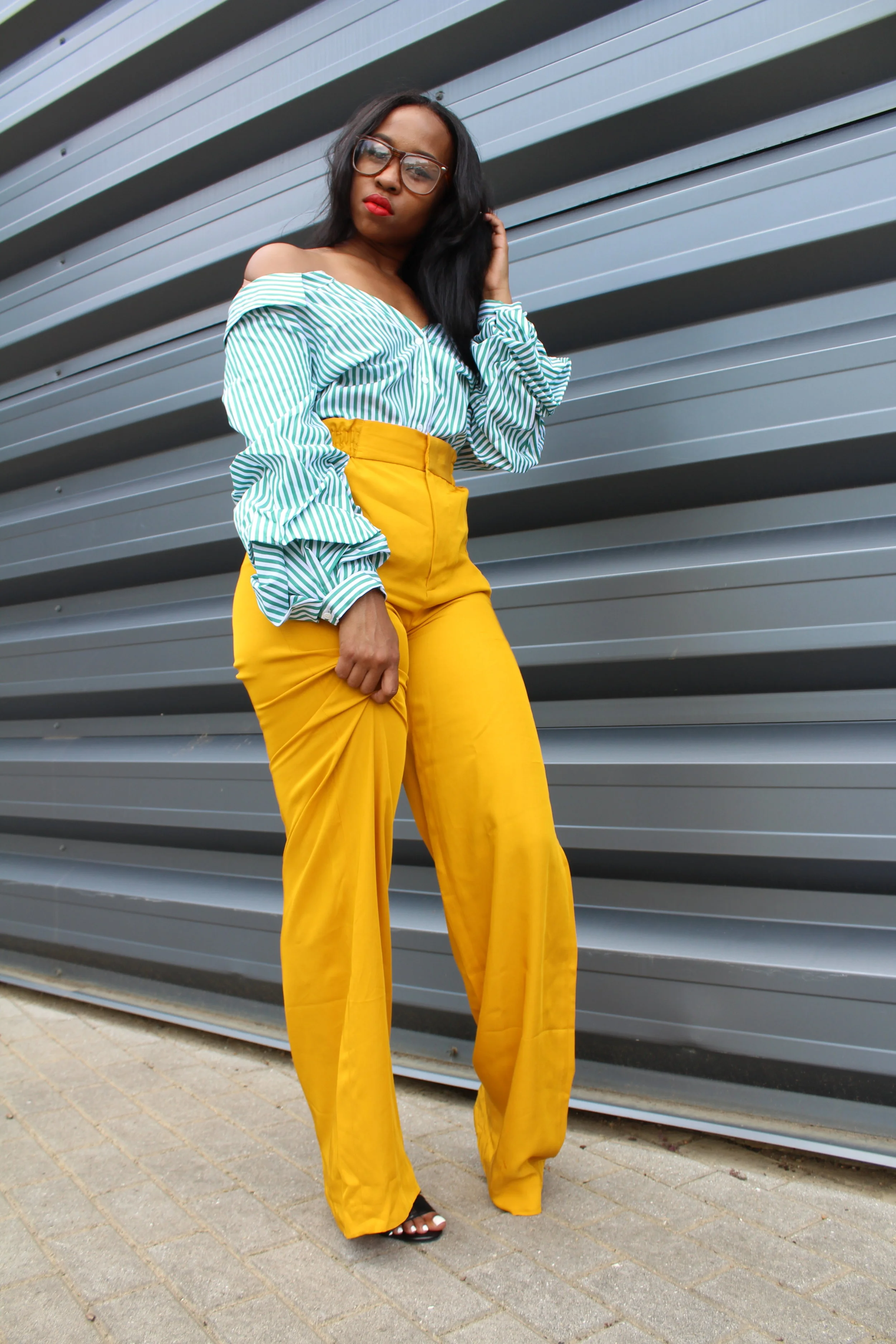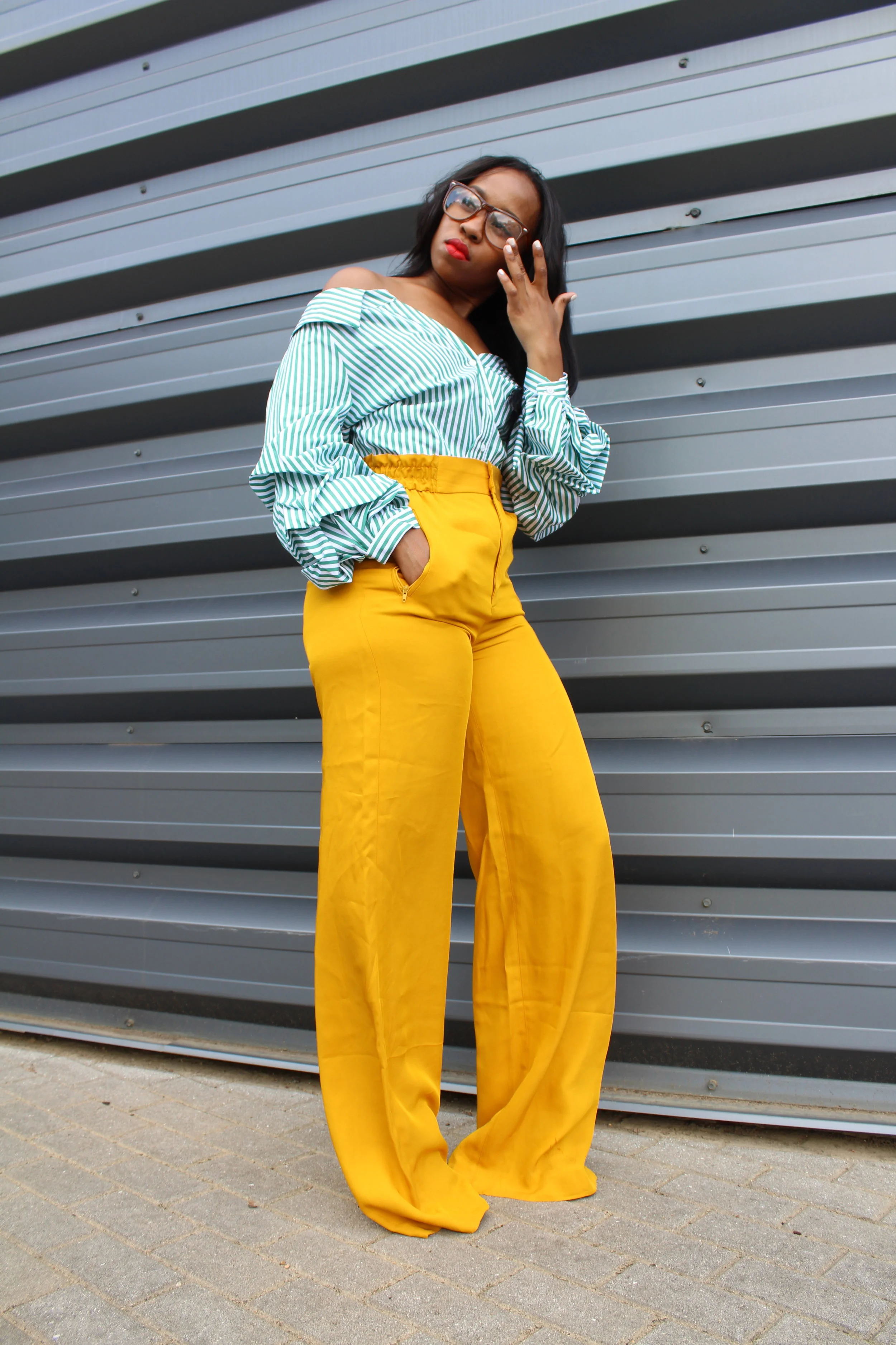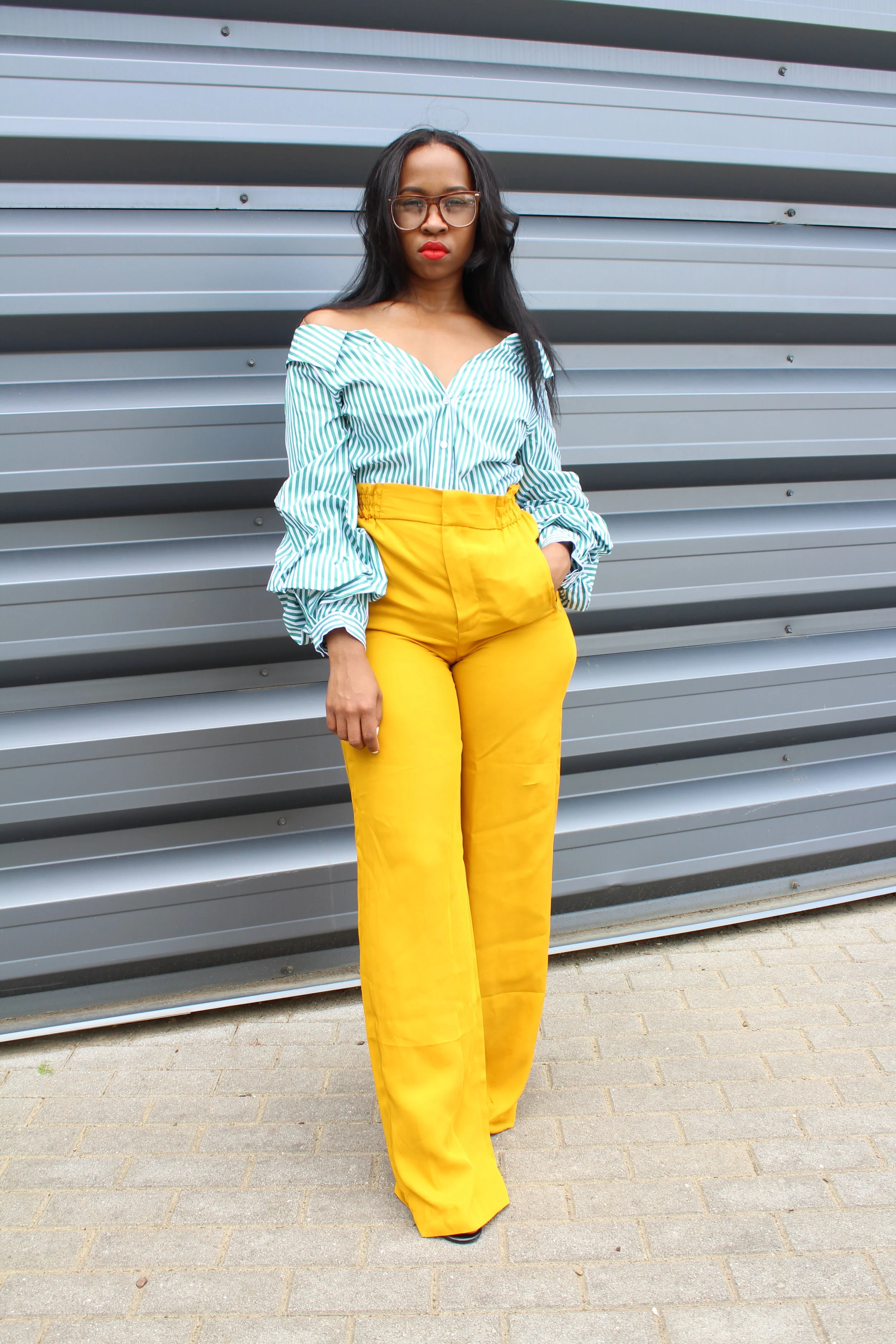 You already know that the shirt style of the summer was the off-the-shoulder top. Now that seriously everyone is wearing it, you might start wondering if it's a bit passé, but hear me out—this is one of those trends that just won't die. I stepped out in one that was a bit unique in the sense that it looked more like a work shirt, artfully slung around my shoulders. This fresh styling was paired with a bright yellow ruffled-waisted trouser. I felt this was the perfect way to make the trend feel updated. To add my finishing touches, I accessorized with a caramel vintage pair of glasses and my favorite yet most comfortable all black open toe sandals.