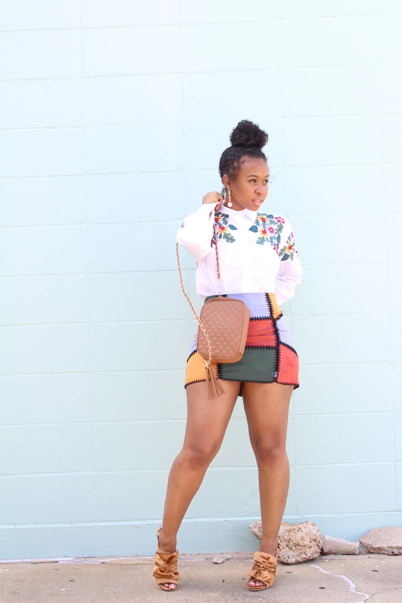Mixing and Matching can be a bit risky but yet super fun. Floral prints are the ultimate trend for the 2017 summer season and I absolutely love my white oversize button-down with embroidered floral prints around the shoulders. My pearl earrings brightens out my crisp white top even more. While pairing my color block mini skirt with vibrant colors, it separated the multi-color statement. Kick off the outfit with a caramel quilted hand bag and bronze ruffled sandals.