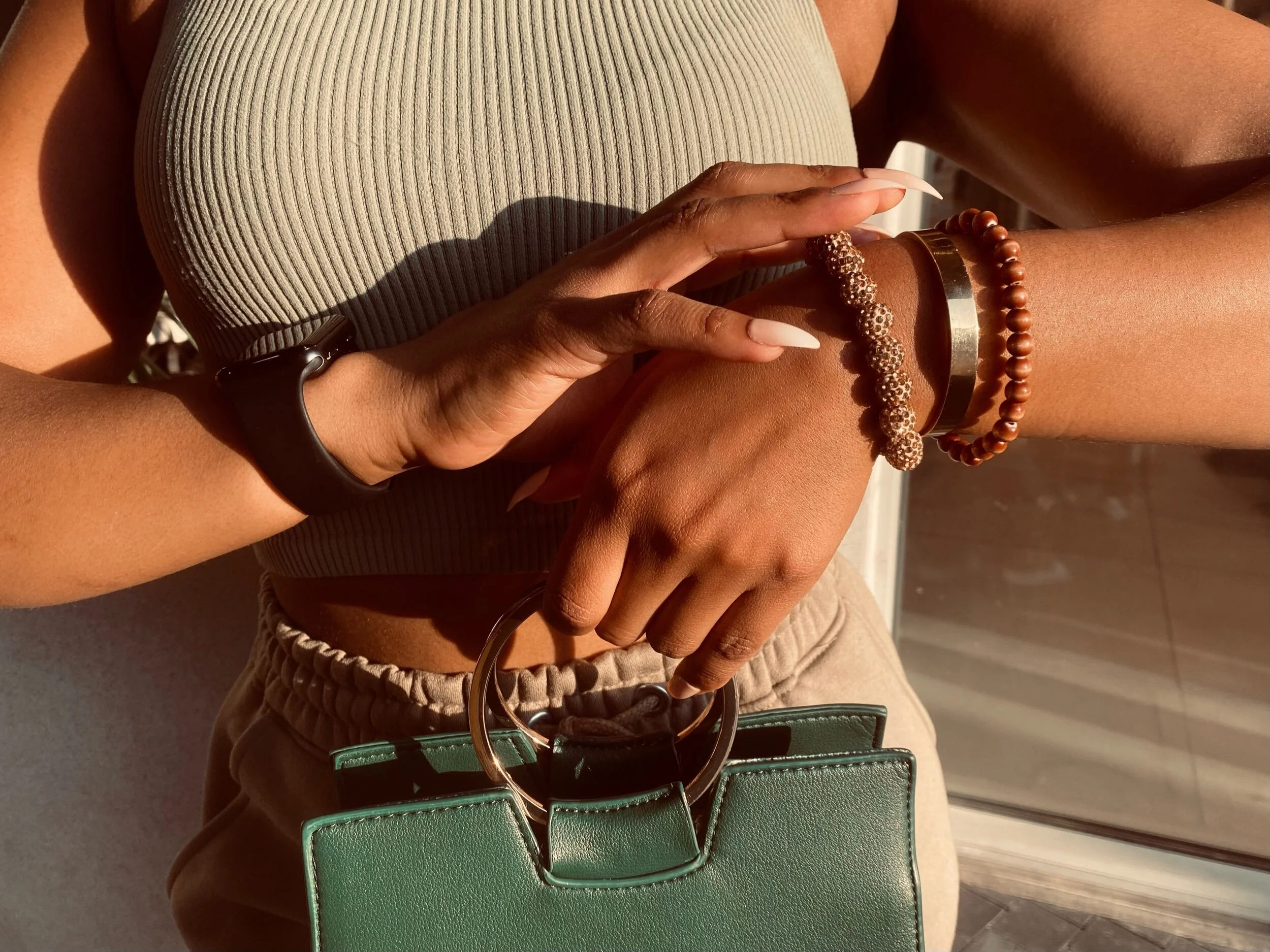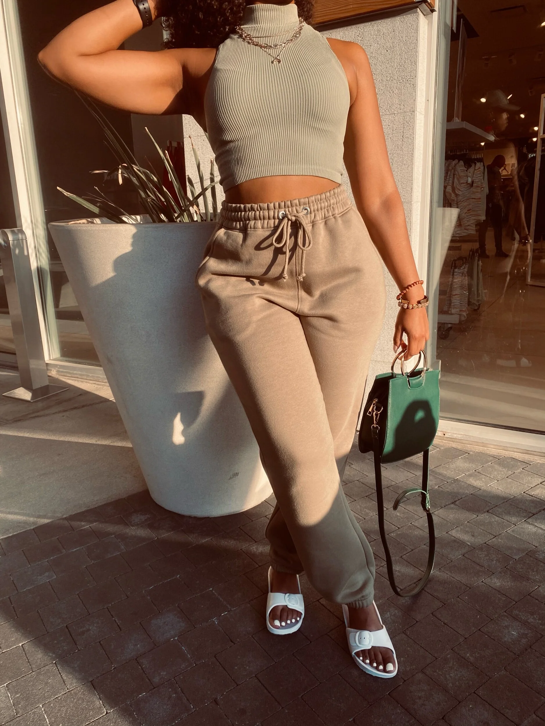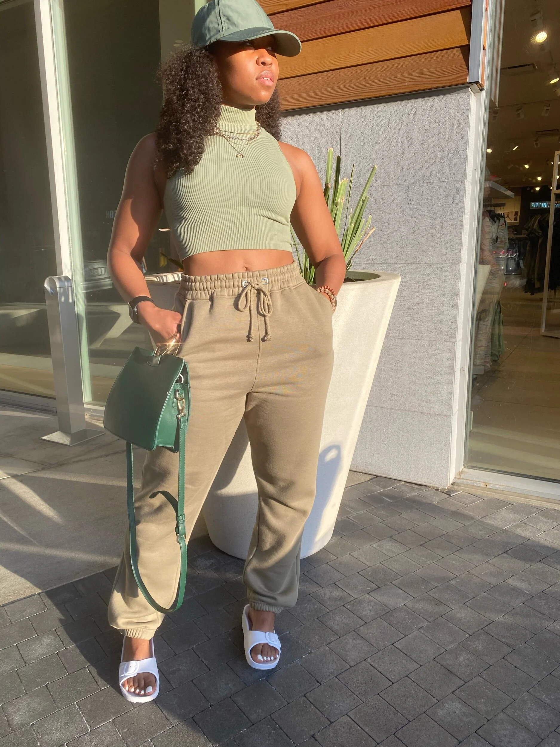 To be honest… I wasn’t going to blog about this look until I got so many compliments. This look caught my eye because olive green is apart of the neutral color scheme. I’m slowly falling in love with browns, taupes, tans, and greens. So I decided why not pair ranges of olive green with comfy sweats since it’s already a trendy look. The elastic stretch, turtle neck crop top was the perfect piece to provide both comfort and style. My accessories included my olive green snapback with my emerald green tote along with my white slides. The white slides finalized this look because it has a soft tone and aesthetic that pairs well with neutral colors.