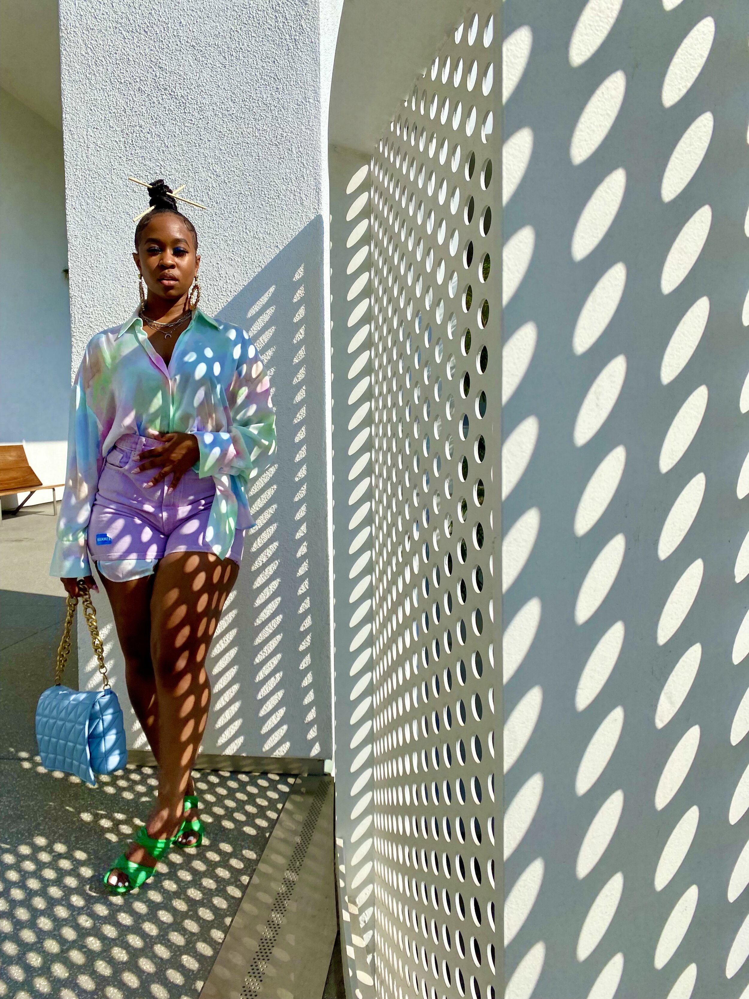 Now with it being so hot but also trying to find a way to be as presentable as possible I decided to wear my tie die silk top. It was definitely comfortable and breezy for the occasion. I paired it with my light purple shorts, green sandals and light blue bag to bring the colors in my shirt to life. Gold jewelry is also my favorite go-to so I definitely did not hesitate to grab my gold necklace(s), gold iridescent earrings and bracelets.
