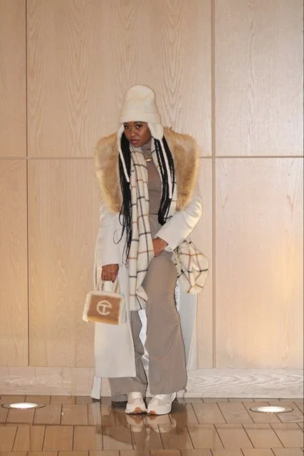Either way, now is the perfect time to bundle up but make it cute by adding as many layers as you’d like. In this instances I started off with a cozy turtleneck and balloon pants. As the temperature drops I added my super soft scarf and my fur trench coat. To add my final layer I paired my knitted beanie and decided to wear sneakers instead of boots for even more comfort when walking.