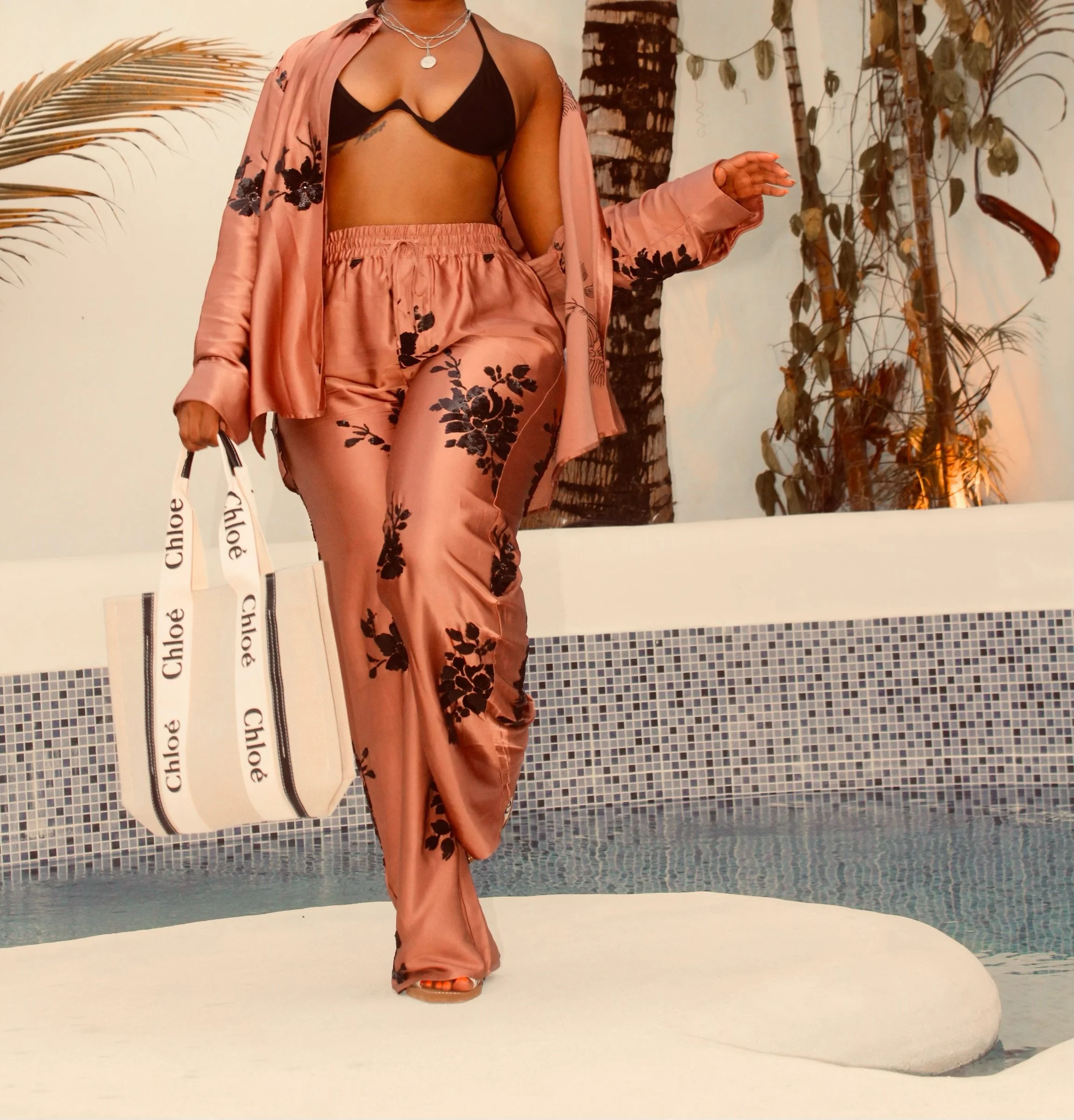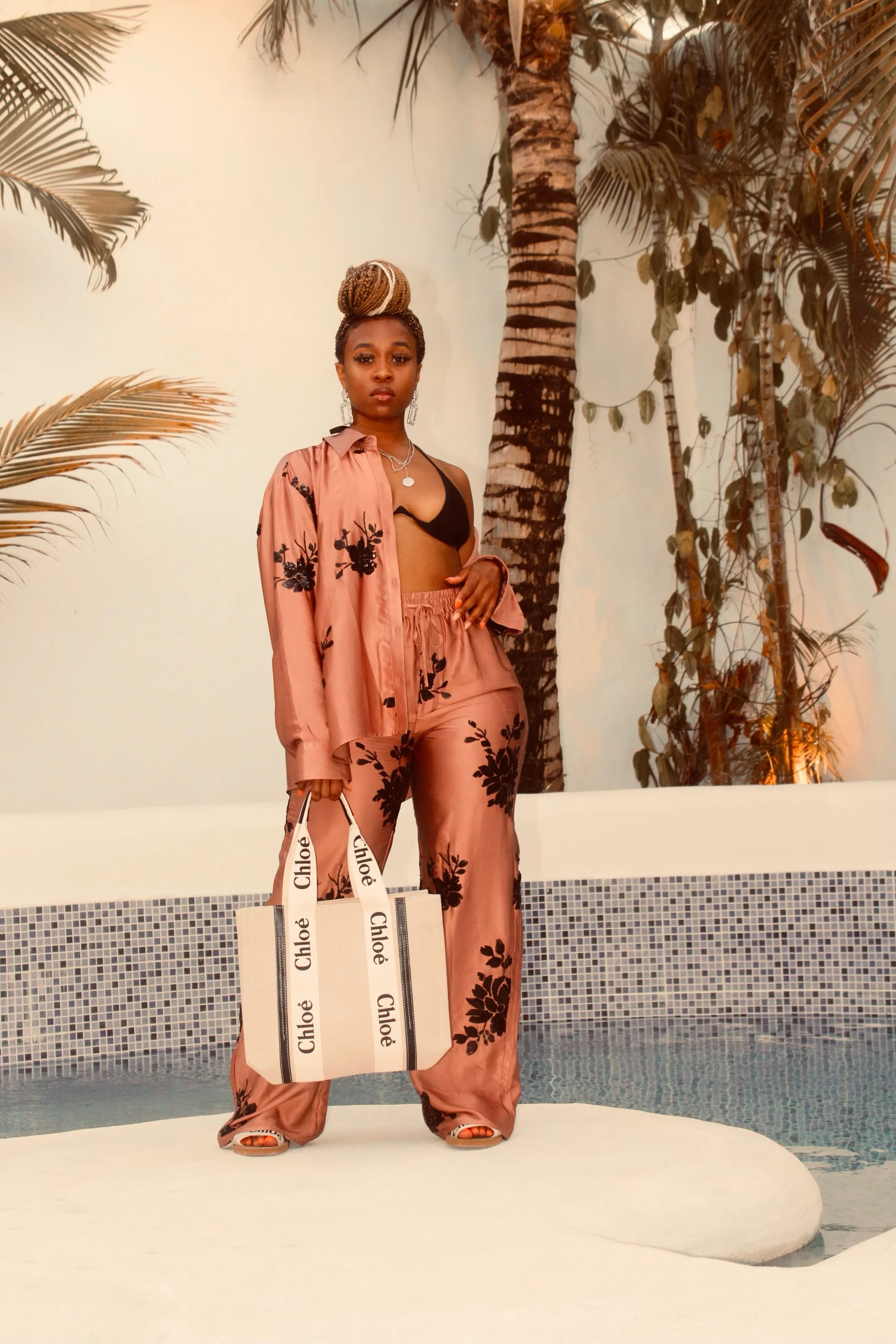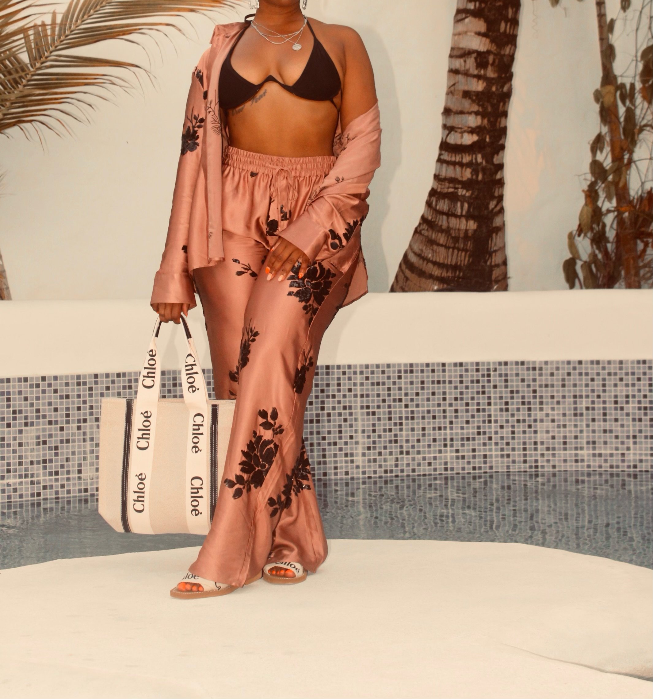 The weather here is really humid and hot so I actually wasn’t sure if wearing this long sleeve silk and sequin two piece set was a good idea. But fashion has no limits right!? While on vacation I was able to pair my black underwire swimsuit. This gave a seductive illusion. I was a little indecisive about the Chole bag and shoes because I’m not a huge fan of mixing prints. But after accessorizing with silver jewelry, I’m not mad at this look at all!