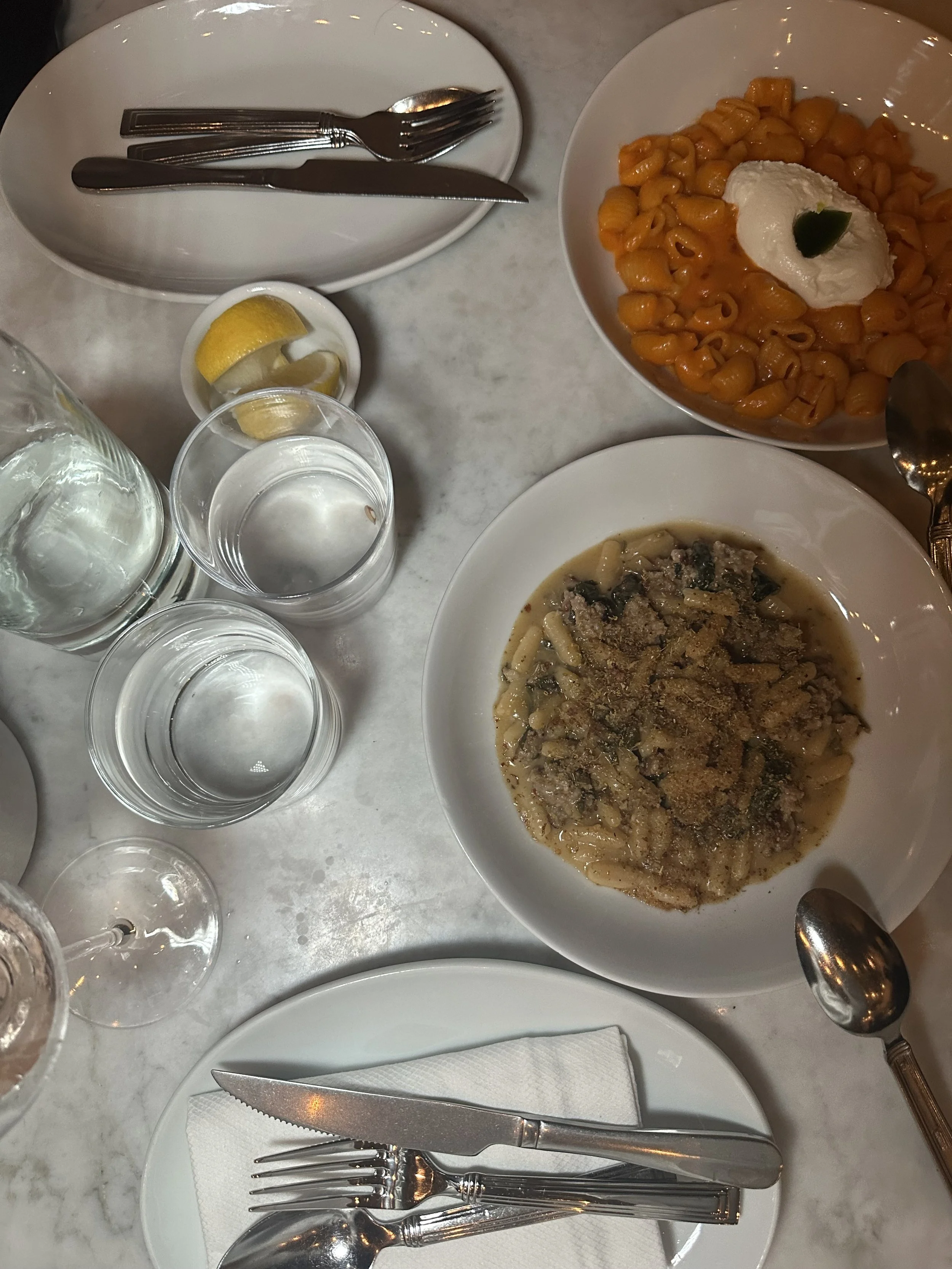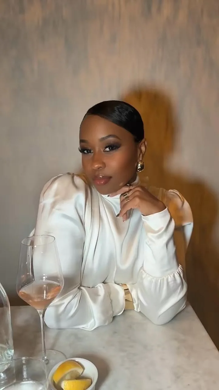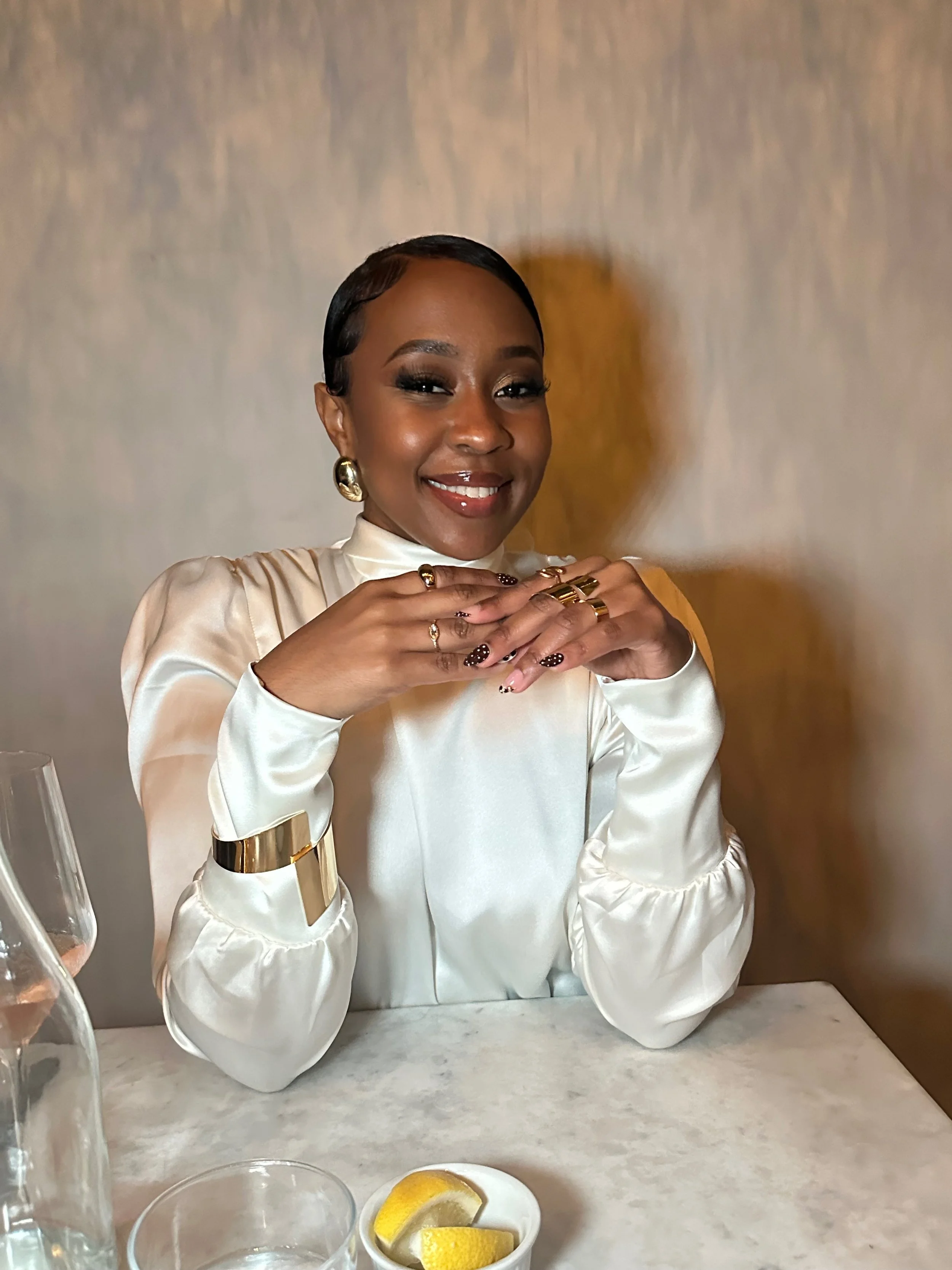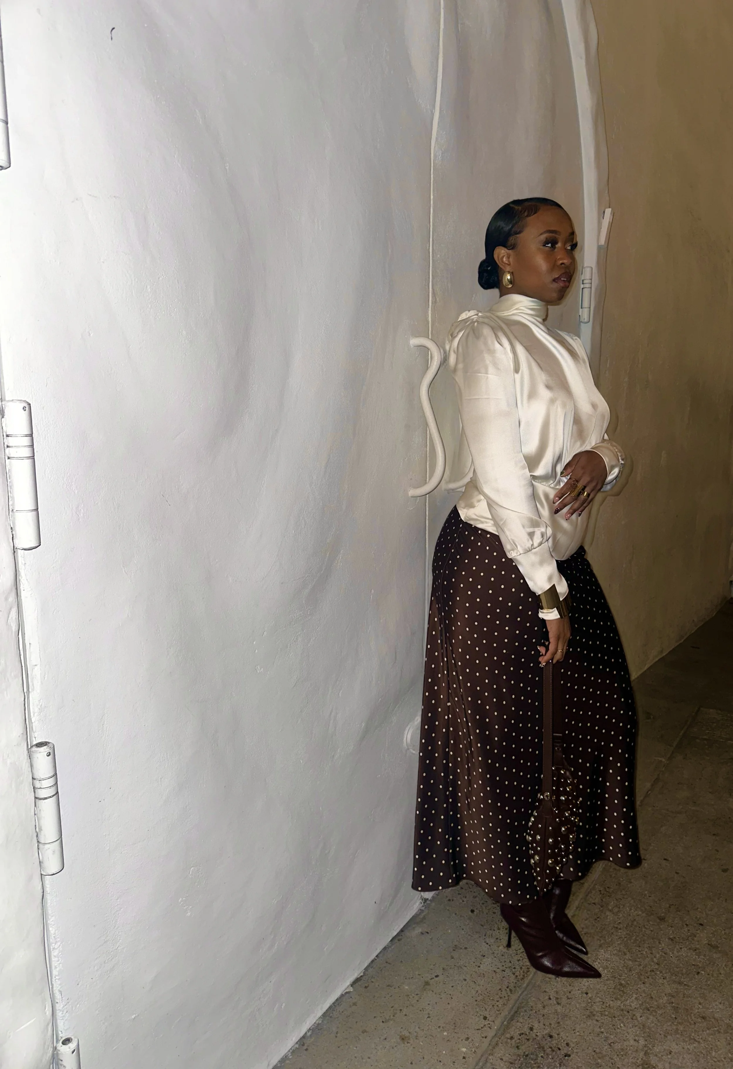 With fall officially here, I wore an ivory silk long-sleeve top to the most amazing pasta bar, and the ambiance matched my color palette perfectly. Polka dots are also a staple print for me, so I was excited to find this stunning long silk polka-dot skirt in chocolate brown. And funny enough, my nails that were done just the day before, were chocolate brown polka dots too, so it all tied together beautifully. I finished the look with brown leather boots, a chocolate bag, and gold jewelry, which complements my skin tone effortlessly.
