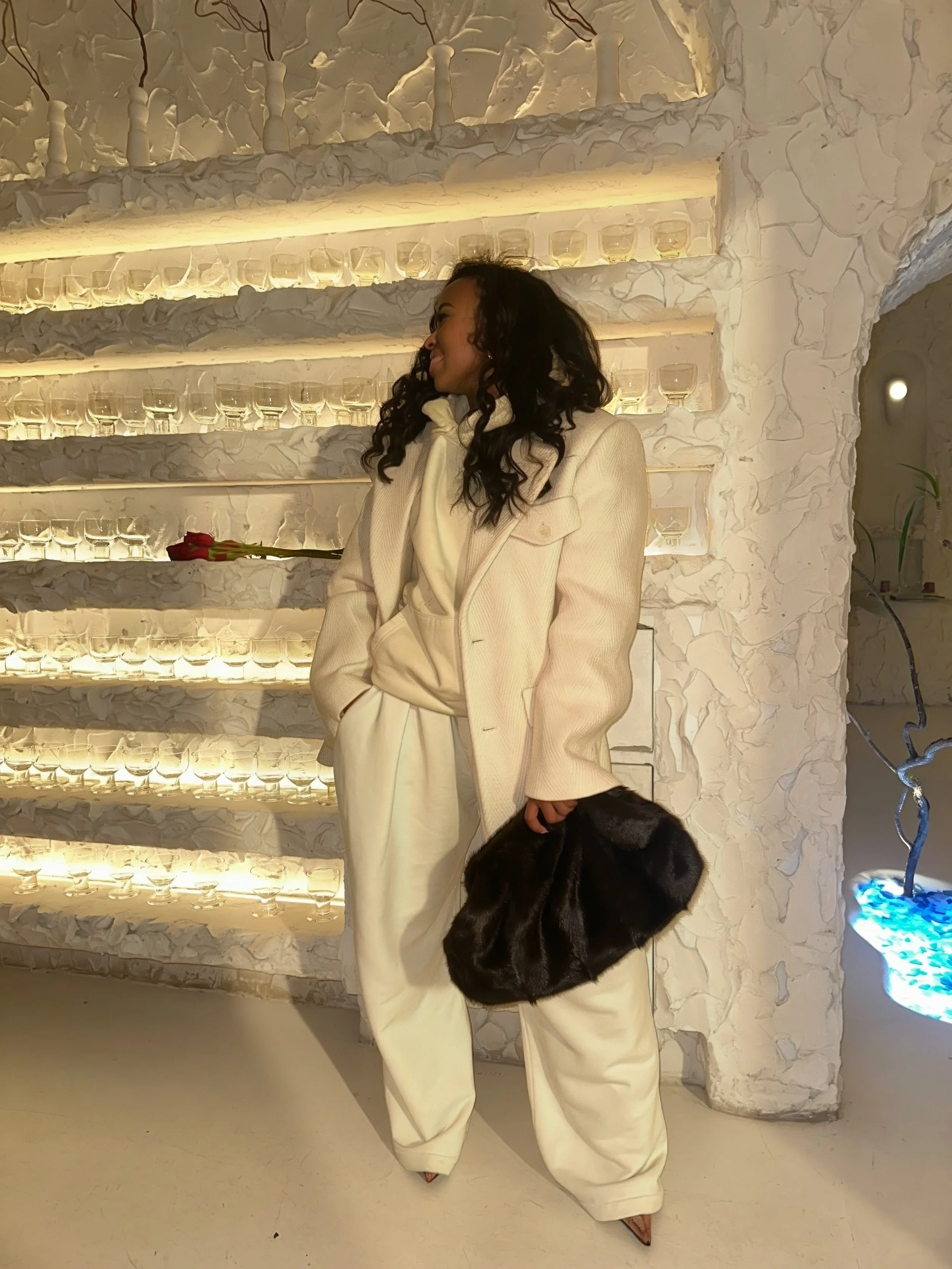 To finish the look, I added pointed heels for a bit of polish and a dark faux-fur clutch to break up the monochrome palette. The accessories bring dimension without overpowering the softness of the outfit.